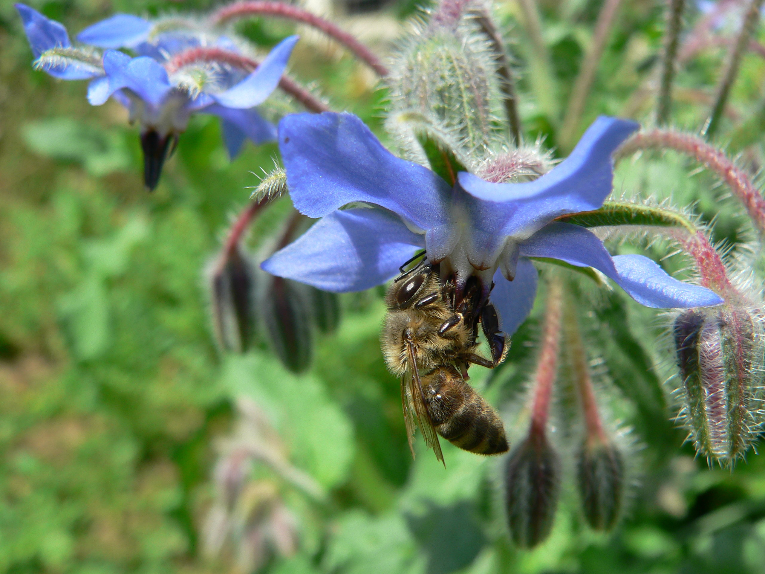 Borretsch nennt man auch Gurkenkraut – weil der Geschmack der Blätter an Gurken erinnert. Außerdem kann man die gut zum Gurkeneinmachen verwenden. Hier auf dem Örtchen gehört Borretsch zu den (vielen) Pflanzen, die das Beet (oder die Welt?) für sich erobern wollen. Er wächst und wächst, eigentlich in jedem Beet – bis jemand hart durchgreift (Schlagwort Unkrautstecher). Aber wie man sieht: die Bienen freuen sich, hübsch sind die Blüten auch und deshalb gibt es so einige Gurkenkrautpflanzen rund um das Örtchen. So, weil das hier mit den Überleitungen so flutscht, bleiben wir beim Thema Blüten: