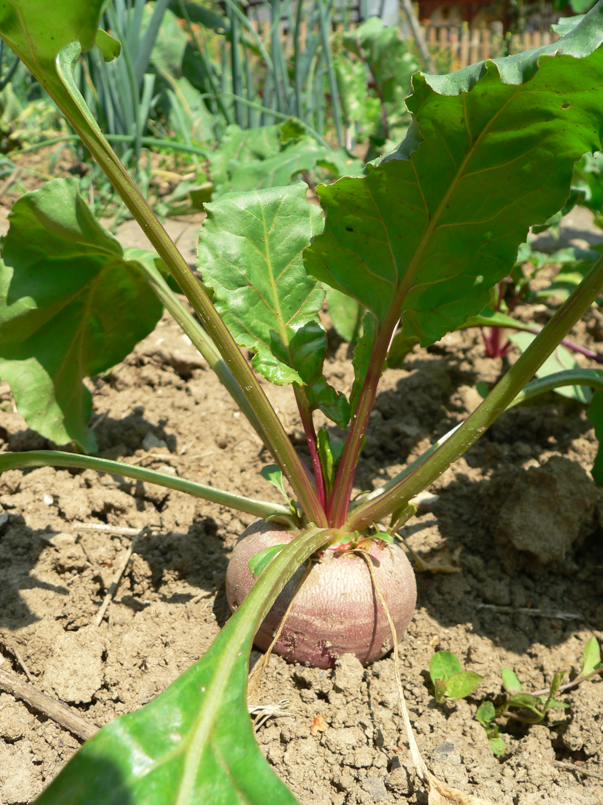 Die Sojabohnen brauchen zwar noch eine Weile bis zur Reife, aber ansonsten geht es los mit der Ernte. Neben Salat, Kräutern, Rettich und so weiter hatten die gemüsevertilgenden Zweibeiner schon die erste Rote Bete des Jahres auf ihren Tellern. Hier das Exemplar, das als nächstes gnadenlos geerntet werden wird: