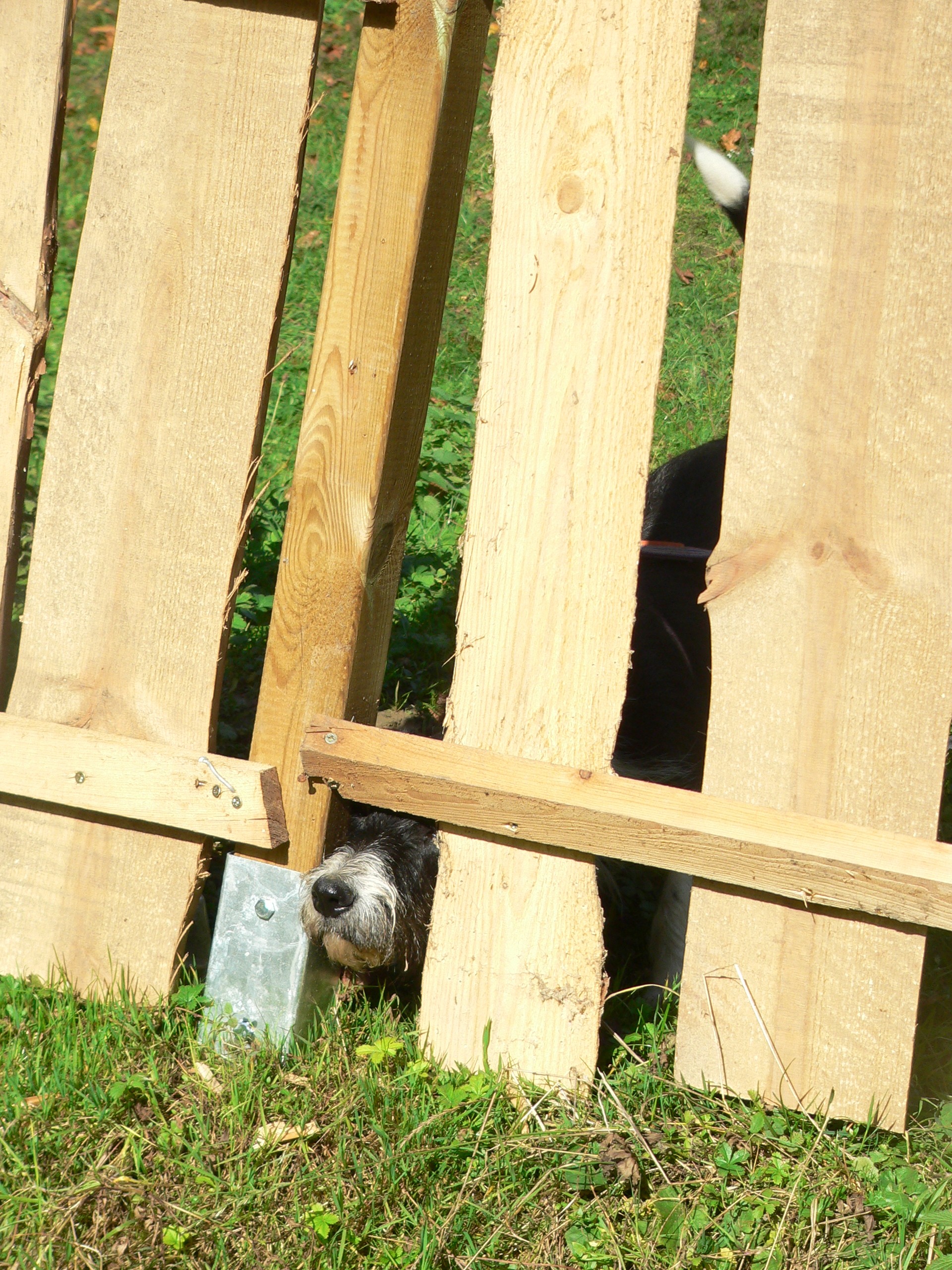 Und dann ging es auch schon rund! Auch wenn Krümel und Fussel um Judith und Steffen lieber noch einen großen Bogen machen, der Auslauf war gleich äußerst interessant, vor allem die andere Seite des Zauns. Der krümelig-winzige Krümel wollte sogleich mehr Freiheit, als zwischen den Latten geboten war, so dass am Zaun schleunigst nachgebessert werden musste!