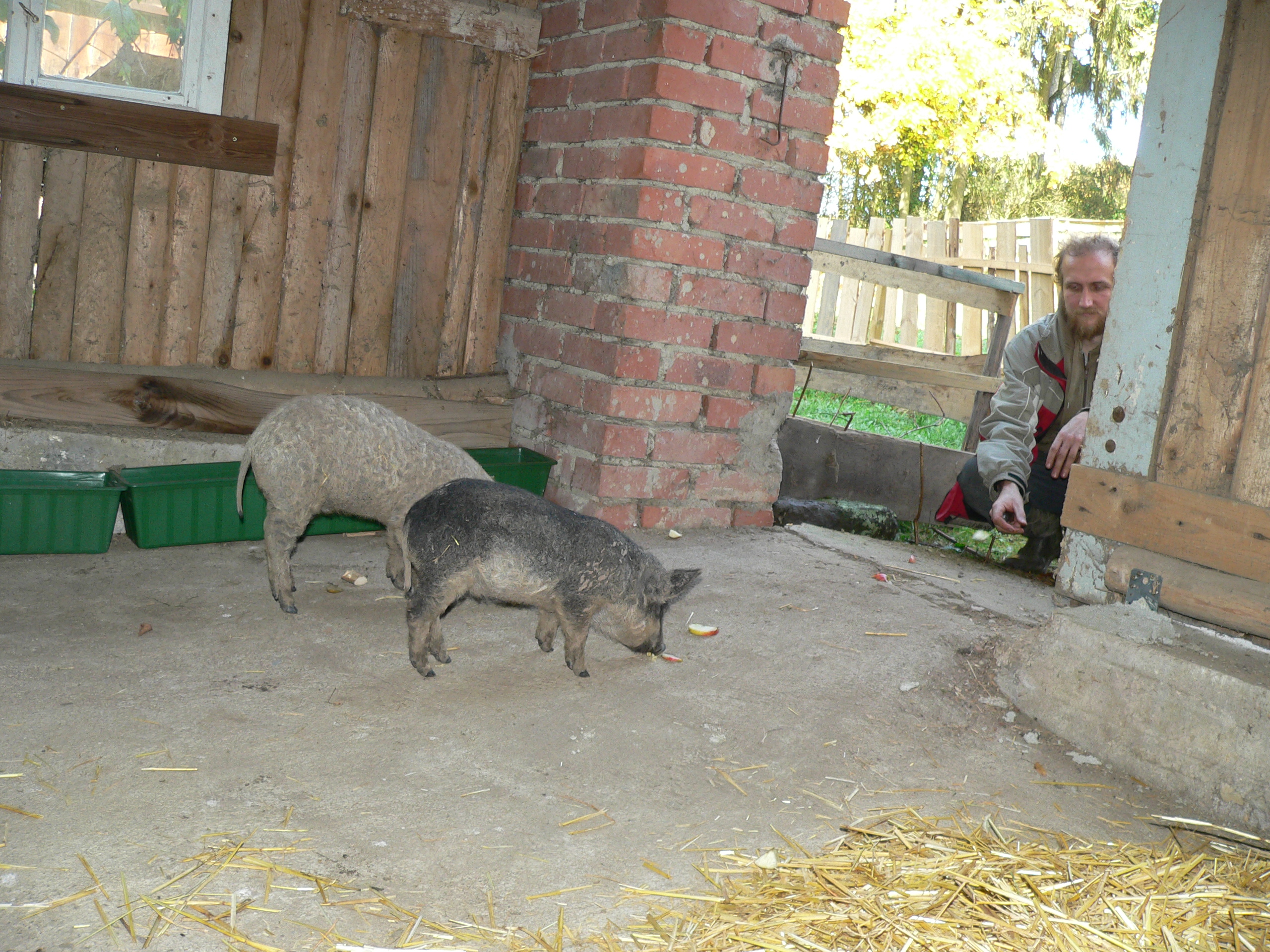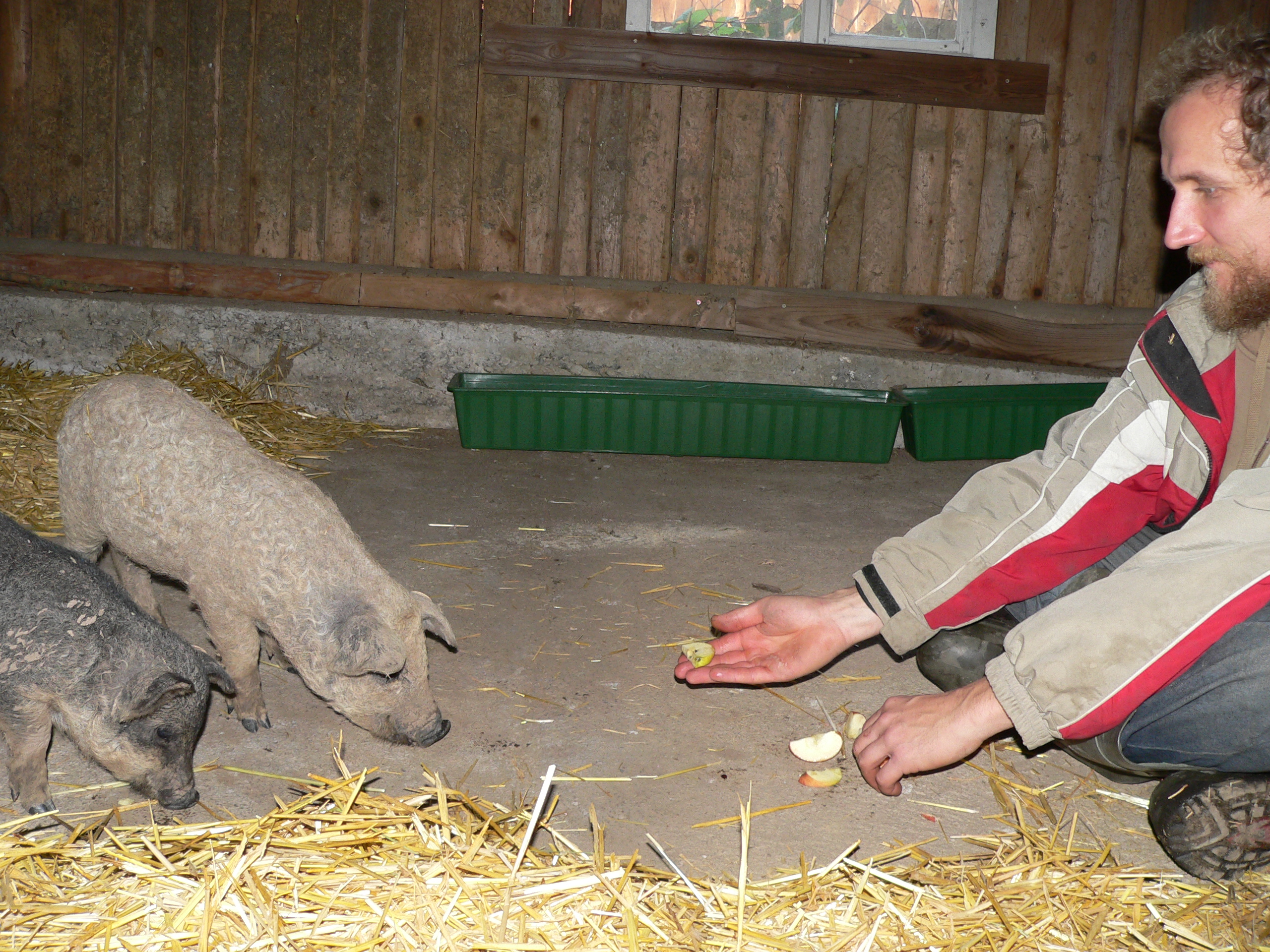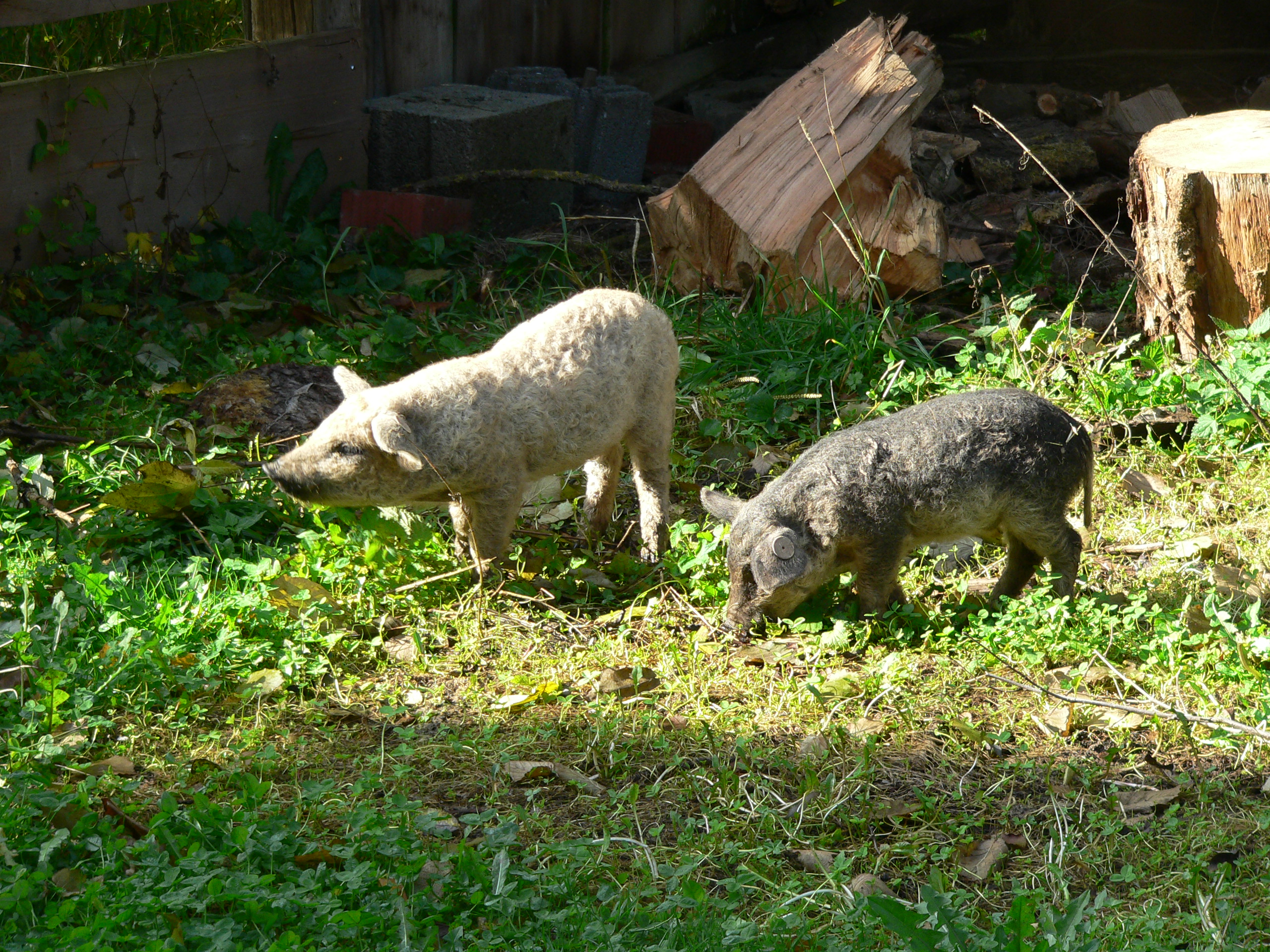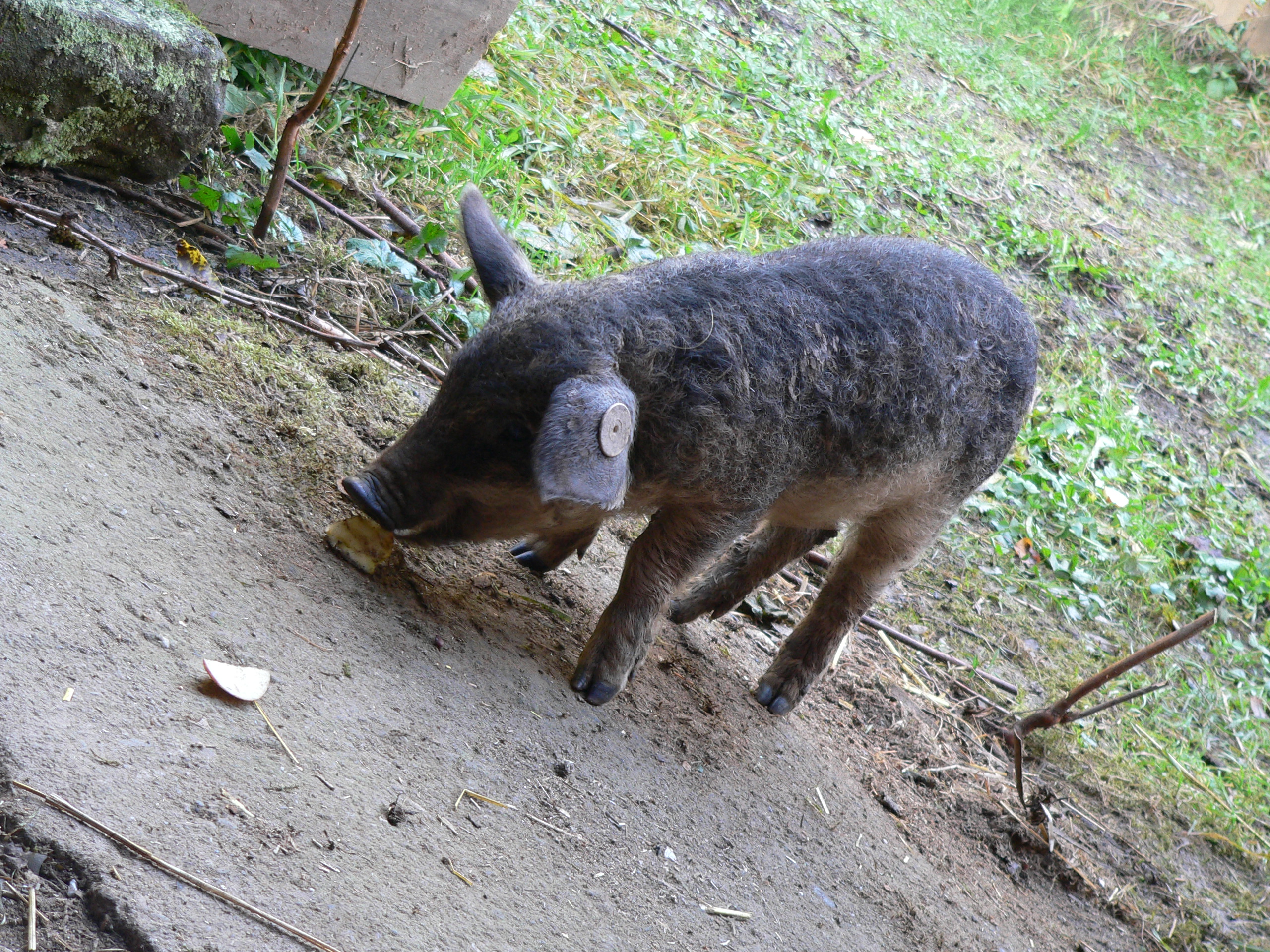 Die beiden sind Wollschweinferkel, etwa zehn Wochen alt. Wie wir ausgerechnet auf’s Wollschwein gekommen sind und warum die so besonders sind, das verraten wir demnächst! Diesmal gibt es zur Einstimmung einfach ein paar schöne Bildchen. So wie das hier – die zwei waren zwar noch sehr schüchtern, aber dank ein paar delikater Apfelstückchen kamen sie den Zweibeinern schon erstaunlich nah!