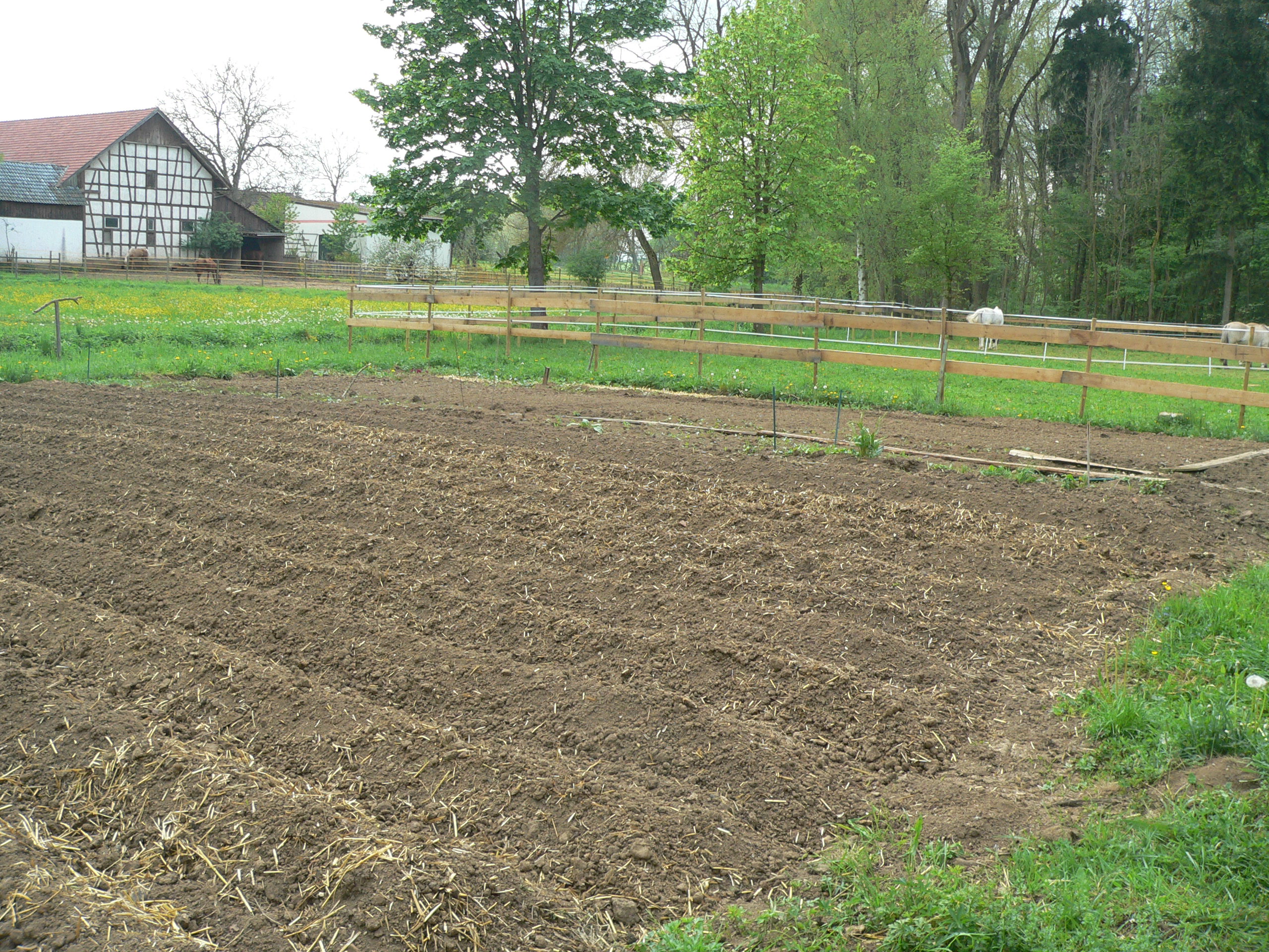 Seit letzter Woche sind auch die Kartoffeln gesetzt. Bamberger Hörnchen aus eigener Ernte vom letzten Jahr, außerdem ein paar „normale“ Kartoffeln, die uns unser netter Ex-Nachbar, der auch mit seinem Traktor den Acker bearbeitet hat, spendiert hat.