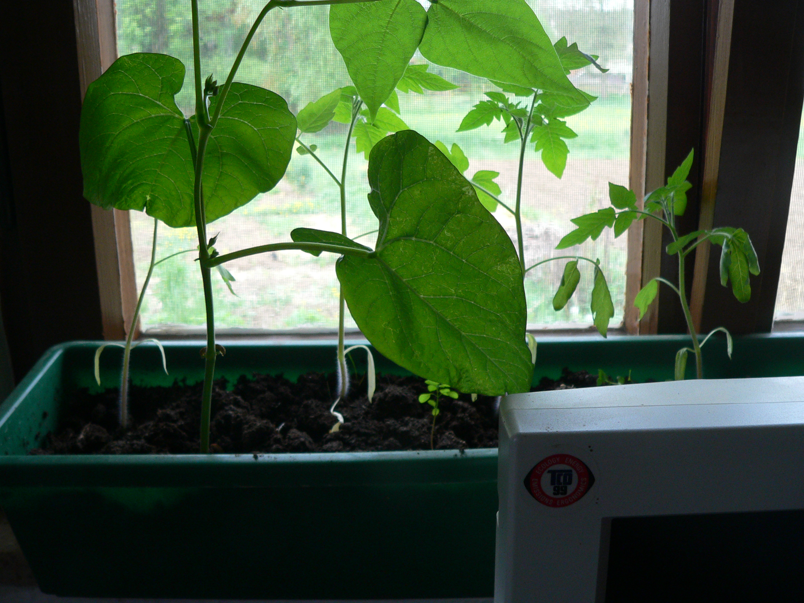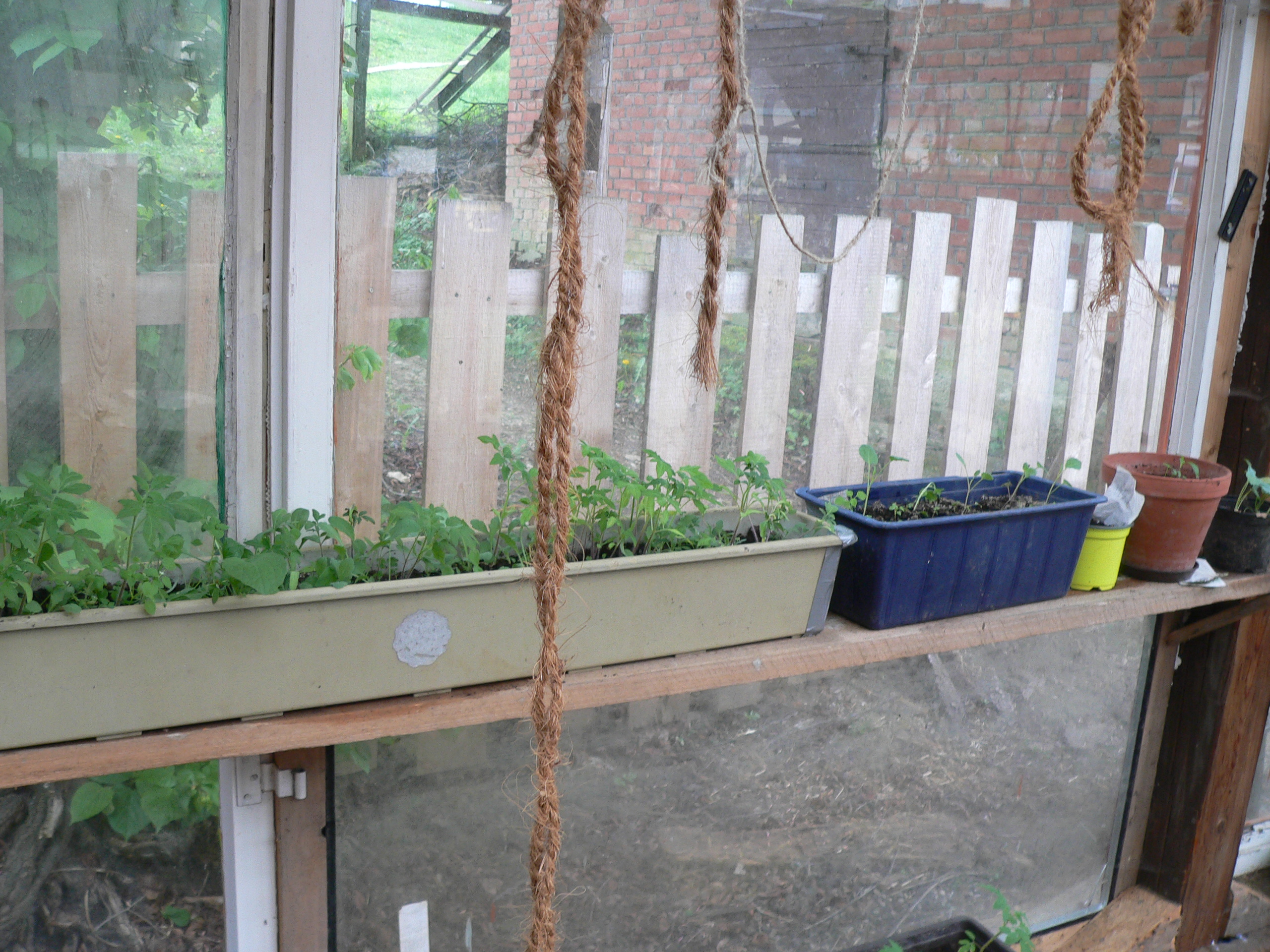 Und noch so eine Wohnzimmervorzucht, die seit ein paar Tagen ins Gewächshaus gewandert ist: Tomatenpflanzen mit einer einsamen Bohne:
